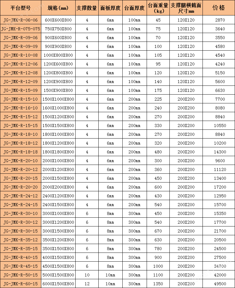 15.重量:100mm厚台面约:120Kg/m2 200mm厚台面约:140Kg/m2 300mm厚台面约:160Kg/m2